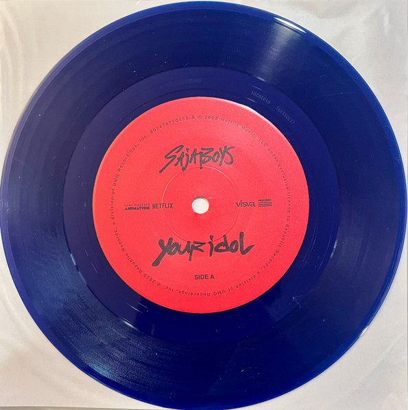 ‘Your Idol’ is a song by Andrew Choi, Neckwav, Danny Chung, Kevin Woo and samUIL Lee, aka the fictional K-pop boy group the Saja Boys from the animated fantasy film KPop Demon Hunters. It’s the pivotal villain song as the Saja Boys use their final performance to hypnotize their audience. Pressed on 7″ purple vinyl it includes a bonus sticker sheet and 1 of 3 photo cards.